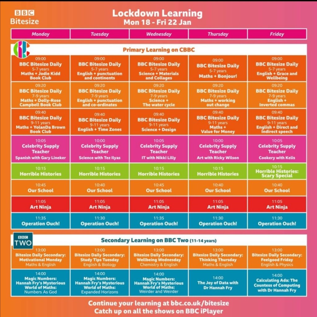 Check out this week’s homeschooling programmes on CBBC and BBC2 below and lots of online Bitesize learning here.