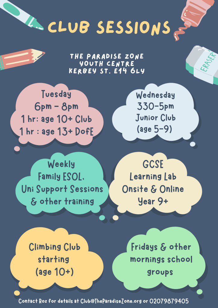 Autumn Term 2022 September 20, 2022 • The Paradise Zone Youth Centre Hope everyone’s settled back at school. Here’s the timetable for our Autumn programme with other times TBC & we will adjust as needs must. Look forward to seeing everyone! Related